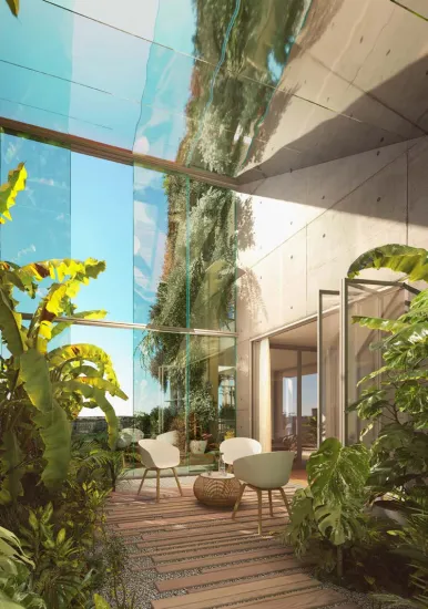 La volonté de construction de ces appartements est claire: flouter la frontière entre l’intérieur et l’extérieur. En commençant par la nature luxuriante changeante au cours des saisons, qui habillent la façade, les appartements se jouent aussi de matériaux transparents pour donner une sensation de vivre dehors. Cela en conservant précieusement les prestations confortables de l’immobilier neuf. Les pièces généreuses sont donc ornées de belles baies vitrées avec des vues panoramiques sur la ville pour certaines, dans des appartements isolés à merveille, plongeant sur des jardins (dont certains sous serre) et des terrasses privatives.